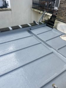 Installation of a Fibre 10 liquid plastic topcoat, forming a seamless waterproof membrane across the roof surfaces